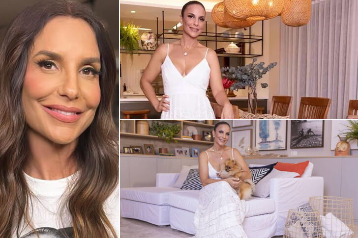 O imóvel, situado em um condomínio de luxo, tem amplos espaços integrados — sala, jantar e cozinha — e segue o estilo do design brasileiro contemporâneo, com madeira, palha e ferro em destaque. Com piscina, jardim exuberante e tons suaves de azul e verde, o lar transmite paz, frescor e o inconfundível astral baiano da artista.